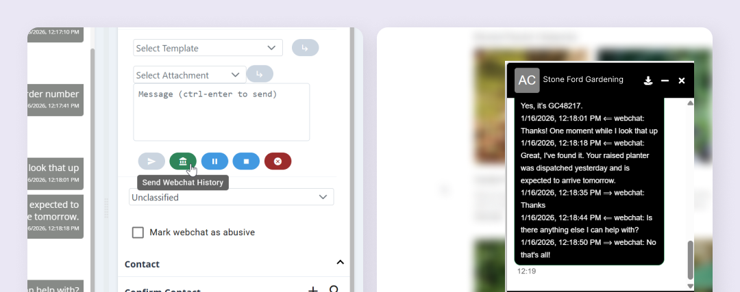 To share chat history with a customer click the history icon and a full transcription of the webchat will be sent to the customer.