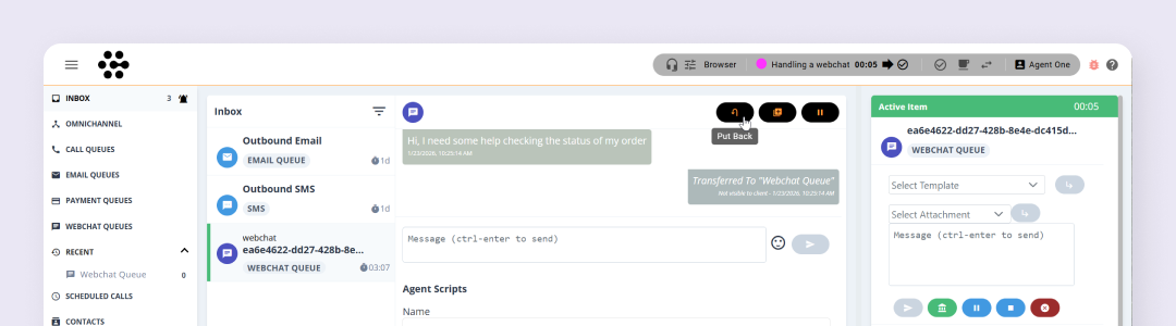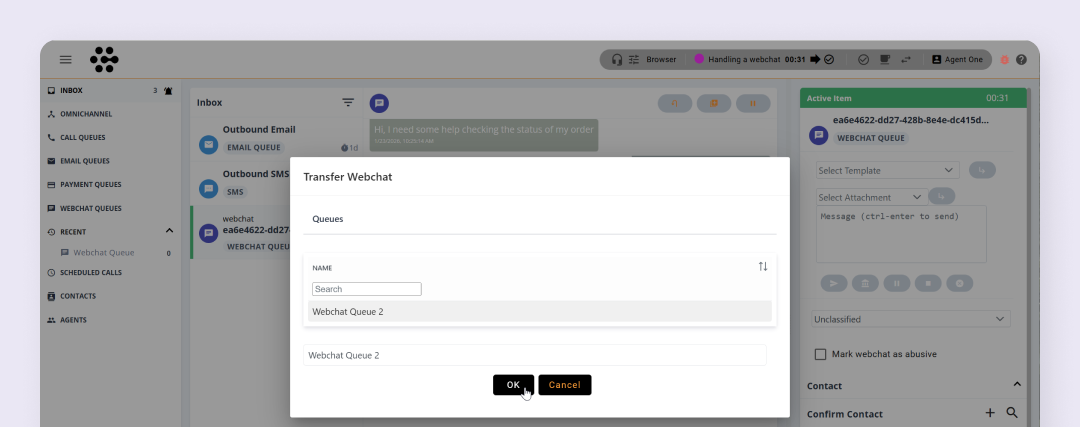 As an agent, you can transfer webchats from any queue you are assigned to into your inbox so you can work on them. You can also transfer webchats back to a queue, making them available for another agent to pick up. If you are assigned to multiple webchat queues, you have the option to return a webchat to its original queue or transfer it to a different queue as needed.