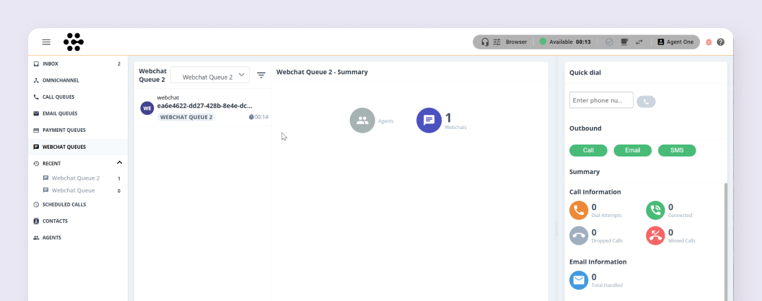 To work on a webchat, it must be in your inbox. Depending on how webchat has been configured by your company administrator, incoming chats are either automatically allocated to your inbox or placed into webchat queues to be picked up by an agent.