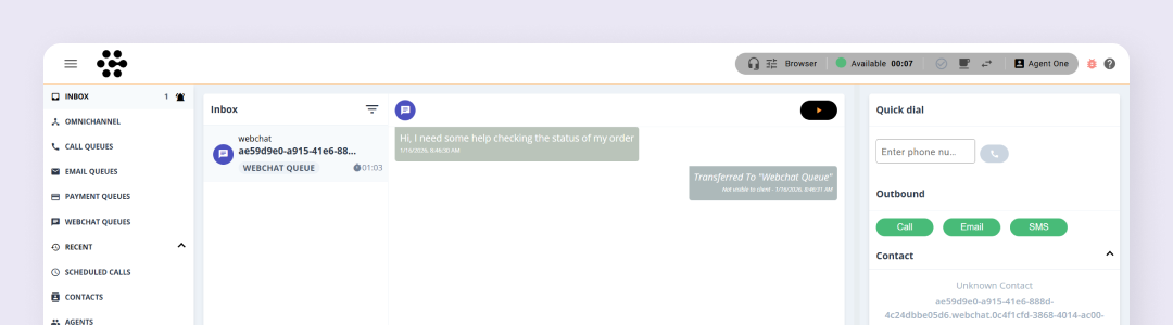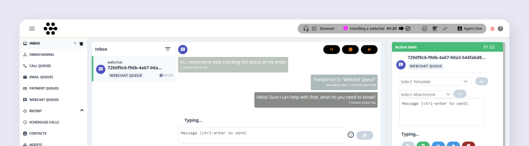 Webchat also includes a range of features to help you manage conversations efficiently. Response templates can be used to speed up replies and maintain consistent, professional messaging. You can pause a webchat to retain ownership and return to it later, or transfer the chat back to a webchat queue so another agent can pick it up if needed.